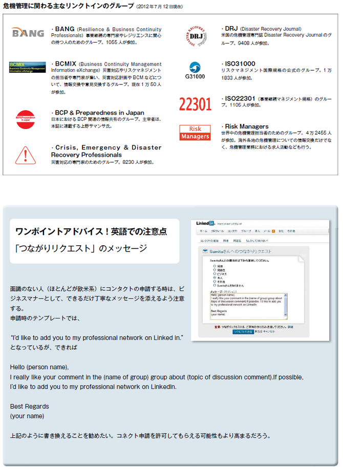 利用者数が多いSNSの1つとしてリンクトインは、ツイッターやフェイスブックとよく比較されるが、最大の違いは、フェイスブックとツイッターが情報を時系列に次々に発信するフロー型のSNSなのに対し、リンクトインは情報を蓄積することに重点を置くストック型のSNSである点だ。そのため危機管理での利用として考えた場合、震災直後から被災状況や安否状況の情報発信するツイッターのようなリアルタイムでのコミュニケーションにリンクトインは向かない。むしろ、これまでに蓄積された多くの有益な情報を基に、高い信頼関係を構築し、ネットワーク内の議論や情報交換を通して、日常から危機発生に備えて対策力を高めることに役立つ。