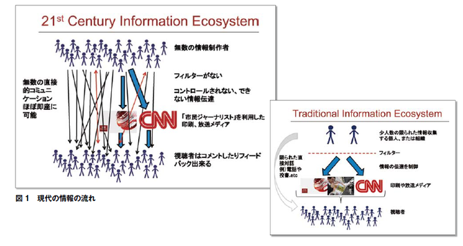最近まで、情報はメディアによって管理され、印刷やTVを使って視聴者に配信されていた。よりダイレクトな情報の伝達は、電話や手紙で一対一だった。今や、私たちは「市民ジャーナリスト」の時代に突入し、誰もが携帯電話を持ちコンテンツを作り出し、ユーチューブなど、いくつものインターネットによる経路を通して瞬く間に情報を一対多数に配信することができる。視聴者は、簡単に第一資料を手に入れることも、自分達の情報を生かしてコメントしたりフィードバックしたりすることもできる(図1)。