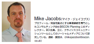 災害時、事業継続を実現する上で適切な情報収集は不可欠だ。東日本大震災では固定電話や携帯電話が十分に機能しなかった一方で、ツイッターやフェイスブックを使った情報収集が注目された。危機管理の新たな情報管理の変化について、英国BCPコンサルタントディレクターのMikeJacobs氏が解説した。
