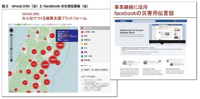 地図アプリケーションであるUshahidi(ウシャヒディ)platformを基に、情報共有を目的として作られたsinsai.info“東日本大震災 みんなでつくる復興支援プラットフォーム”は、震災発生から4時間以内に立ち上げられ、震災から1か月以内に、個人のメッセージから政府の通知まで、ツイッターやEメール、ウェブサイトへの直接の連絡など、1万を超えるレポートが送られた。ページ閲覧は100万を超え、集まった情報はヤフージャパンやグーグルの震災特設サイト、そして日本政府復興庁と共有され、情報提供を通して復興を支援する民間プロジェクト「助けあいジャパン」でも利用された。