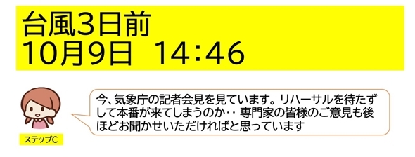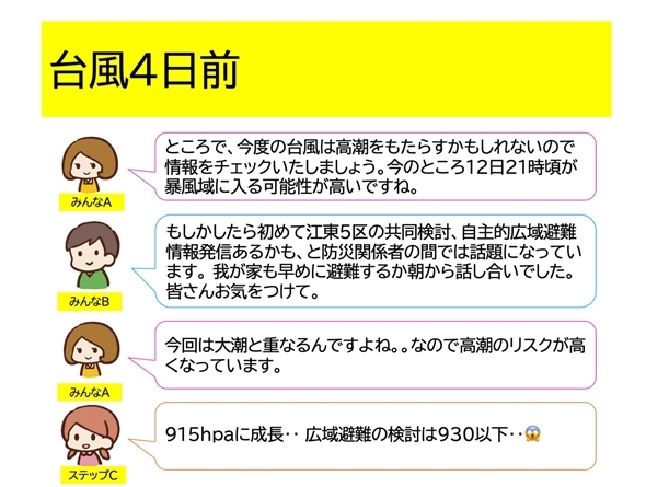 台風4日前から情報収集が始まっています。台風3日前、この「みんな」は、10月末のイベントの打ち合わせの会議があり、会議前にはこのような会話が交わされます。