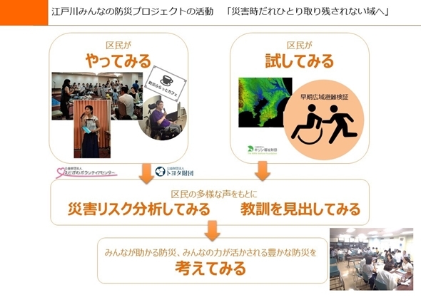 そんな難しい状況の中、STEPえどがわは、どのように動いたのでしょうか? STEPえどがわは、江戸川みんなの防災プロジェクトに立ち上げから主体的に参加していました。この江戸川みんなの防災プロジェクト(以下みんな)は、地元の防災専門家など個人有志の方とえどがわボランティアセンターが一緒になり「災害時、誰ひとり取り残されない地域のために、気軽に防災について話そう、いろいろやってみよう」という考えのもと、学習や交流の機会を図っているグループです。