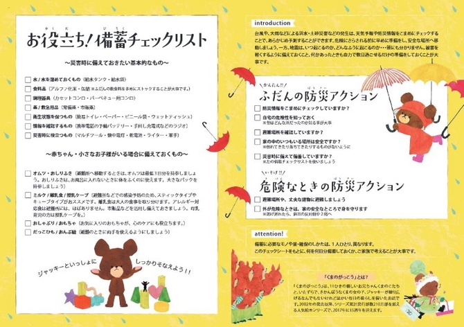 自然災害から身を守るための防災アクションを、「くまのがっこう」の人気キャラクター、ジャッキーと一緒に学べるもの。