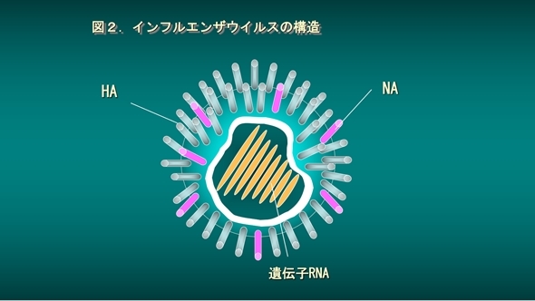 インフルエンザウイルス粒子の表面には、図2に示すインフルエンザウイルス模型図のように、2種類のスパイク、すなわち、鶏の赤血球を凝集するスパイク(A型ウイルスでは HAまたは Hと呼ばれる)と、ノイラミン酸を分解する酵素活性を持つスパイク(A型ウイルスではNAまたはNと呼ばれる)があります。ウイルスが感染する際に重要な役割を果たすのはHAです。HAの性状により、感染できる動物の種類、病原性の強さが規定されます。NAは、ウイルスが感染して多数の子孫ウイルスを製造してくれた細胞から、さらに別の細胞に子孫ウイルスが感染するために、その細胞から遊離する時に機能する酵素活性を持っています。