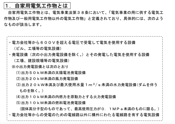 なぜなら、日本では電気事業法38条というのがあって、1万W以上の発電機は「自家用電気工作物」に該当します。