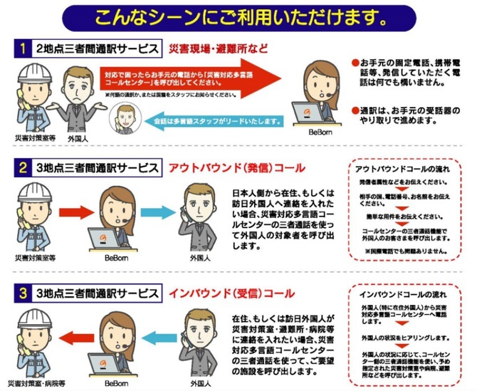 電話通訳サービスなどを行う株式会社ビーボーン(本社:福岡県福岡市)は、11月21日から全国の自治体を対象に、災害時の訪日外国人・在住外国人とのコミュニケーションサポートを行う「災害対応多言語コールセンター」サービスの提供を開始したと発表した。