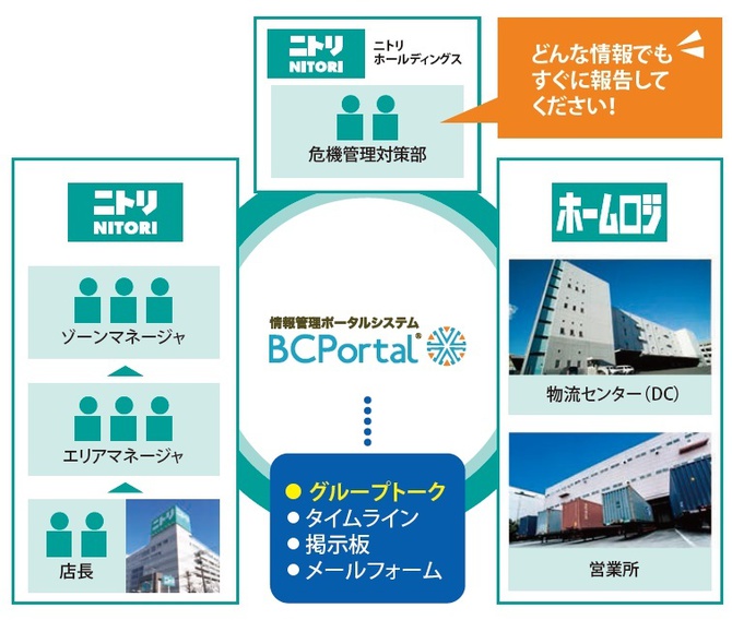 熊本地震の際、同社の物流部門の子会社であるホームロジスティクスでもシステムが活用された。お客様に商品を届ける営業所と営業所に下ろす倉庫(DC)とのやり取りでBCPortalを利用。DCについては被害がなかったため、熊本の営業所へ被害確認で活用した。2日目・3日目については復旧に向けた動き出しにおいて、被災地への商品共有等について、九州地域をつないで連絡を取ったという。「ホームロジスティクスは、建家の状況、お取引様の情報、車両の状況、店舗・営業所への搬入など、役割分担をある程度しないと全体を把握できないのですが、メールの場合、この部分とこの部分はこの人とこの人がやり取りをしているとか、他の部分は別の人が対応しているなど、その後の情報共有の部分で全体を刷り合わせる必要がありました。また、同じことをいろいろな人に聞かれてその都度説明するという無駄も頻発していました。それが『いま誰が動いている』という状況がグループトークを見れば一目で把握できるので、情報共有の負担が圧倒的に軽くなりましたし、情報の抜け漏れがなくなったところが大きいです。ごくたまにしか発生しない大災害だけを想定して利用するのではなく、より発生頻度の可能性の高い、小さな事故等にも利用されています。店舗では店長・副店長・フロアマネージャーの連絡ツールとして通常業務でも利用しています」(店舗運営部担当者)。