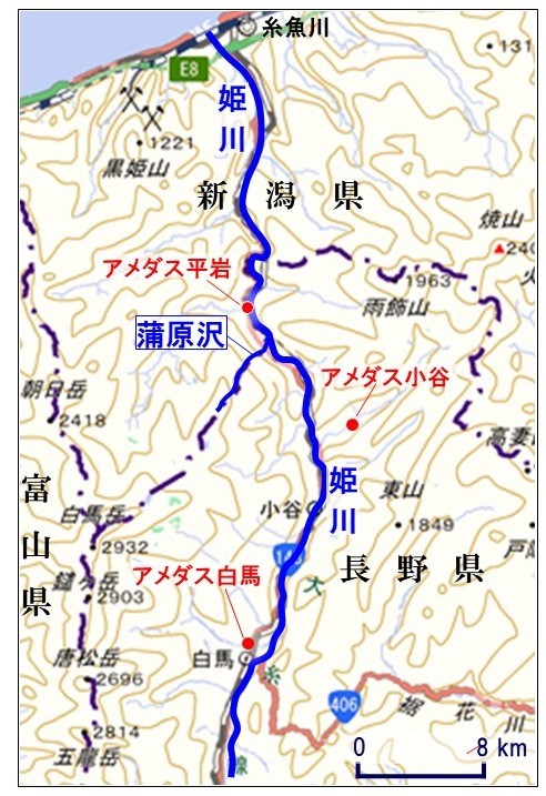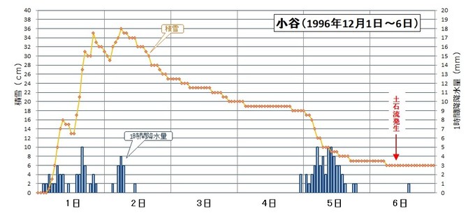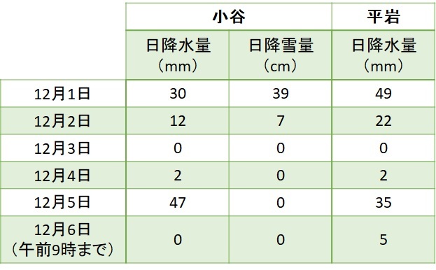 表1と図2に、災害現場に近いアメダス観測点の観測値を示す。6日9時までの前48時間雨量は、小谷(おたり、長野県小谷村、標高550メートル)で49ミリメートル、平岩(新潟県糸魚川市、標高260メートル)で42ミリメートルであった。いずれも、土石流を引き起こすような雨量ではない。