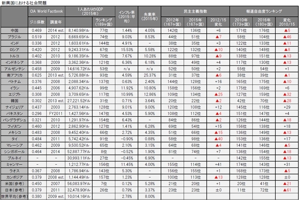■この罠を回避するためには、産業の高度化、必要な技術の獲得、人材育成、社会変革(金融システム整備等)、腐敗・汚職の根絶等が必要となりますが、新興国の多くで、それが進んでいない状況となっています。このことが中間層の拡大を抑制することとなり、格差是正を阻害する要因となっています(図表からも新興国の多くで1人あたりのGDPが20,000ドル以上の国が非常に少ないことが分かる)。