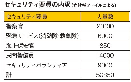 それを踏まえて、現時点での警備体制の推計は、5万850人体制です。そのうち、警察、消防、海上保安庁を除いた民間の警備員が約1万4000人、ボランティアが約9000人。東京2020組織委員会が直接運用するのは、これら合わせて2万3000人ということになっております。
