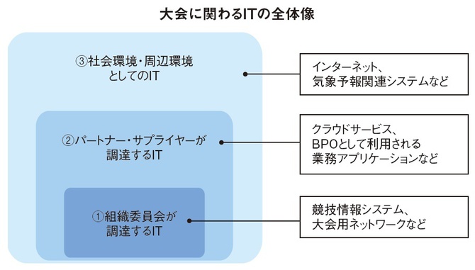 大会運営の業務アプリケーションとして利用するクラウドサービスやBPO(Business Process Outsourcing)など、組織委員会から委託されたパートナーやサプライヤーが主体となって構築・運用するIT系サービスは、近年の国際的競技大会でもその利用の範囲・規模がますます広がりつつあります。