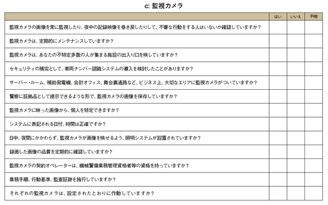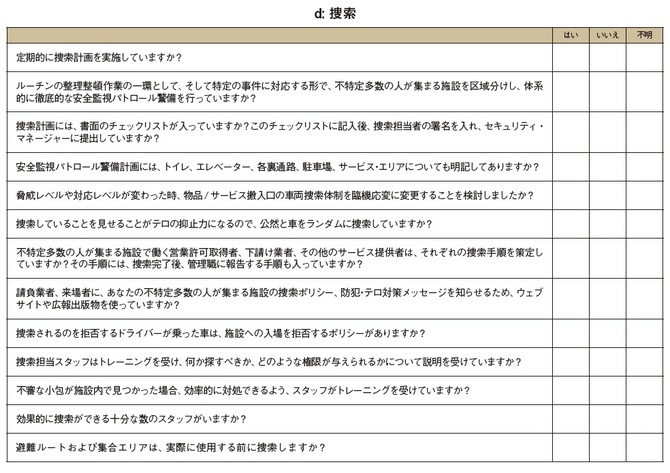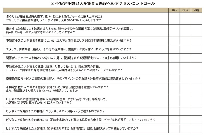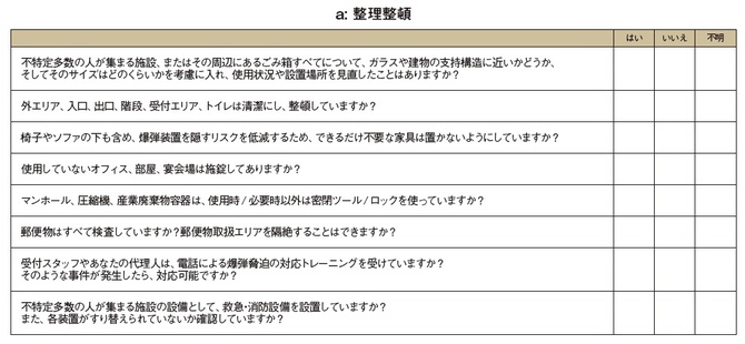 以下のチェックリストは、不特定多数の人々が集まる施設のオーナー、経営者、管理者、スタッフが、テロ対策計画に従って危険性やリスクを特定する際のガイドです。ただし、このリストは包括的なものではないので、このガイダンスのいくつかの項目が該当しない施設もあるかもしれません。また、いくつかの項目は日本向けにアレンジして記載しました。