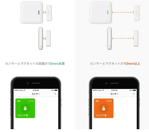 センサーと磁石の距離によって、スマートフォン画面には色分けして表示されるので、一目でチェックができる。