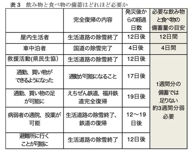 飲み物、食べ物の備蓄が少なかったことは地元紙の紙面からも読み取れます。大雪が積もり始めて生活が復帰するまでの約19日間、住民は節約と我慢で耐えていました。背景には広域雪害への油断があったのでしょう。飲み物と食べ物の備蓄と自立の心がけが普段からあれば、不安の多くは解消されたかもしれません。特に災害弱者(病気、障がいのある人々)は普段の生活を維持するために、特に入念な備蓄を各自心がけることが大切です。