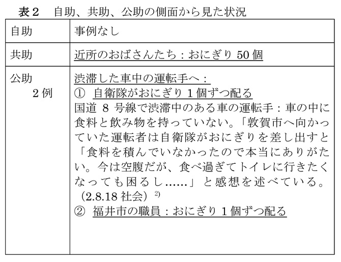 こうした問題に対する、自助、共助、公助の3側面からの行動をまとめました(表2)。