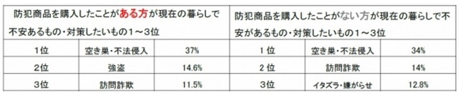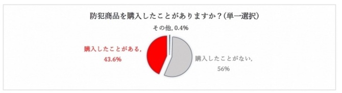 『防犯商品を購入したことがあるか』(第3弾)の質問に対して、「防犯商品を既に購入している」は43.6%。『現在の暮らしで不安があるもの・対策したいものを 3 つ選択』では、購入したことがある人・したことがない人、どちらも「空き巣・不法侵入」が1位となった。2位は、購入したことがある人は「強盗」、ない人は「訪問詐欺」、3位はそれぞれ「訪問詐欺」「イタズラ・嫌がらせ」となった。