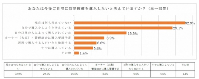 『今後自宅に防犯設備を導入したいと考えているか』(第2弾)の質問に対して、「防犯設備を既に導入している」は5%、自分で購入を考えていたり、近所で導入する人がいたら検討するなど「防犯設備へ何らかの関心を持っている」は60%を超えた。