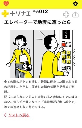 『ゆれくるコール』が今年11月に実装した新しいコンテンツが「+ソナエ」(※)だ。地震が発生した時に役立つ情報や、日ごろから確認したい防災知識をイラストで解説している。「+ソナエ」とは日常生活に「備え」という意識をプラスして、防災・減災意識を高めようというプロジェクトだ。「+ボタン」をタップすることでお気に入り登録が可能。また、ソーシャルメディアへのシェア機能も付いているために重要だと思った知識を家族や友人に共有することができる。