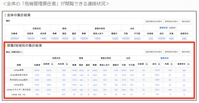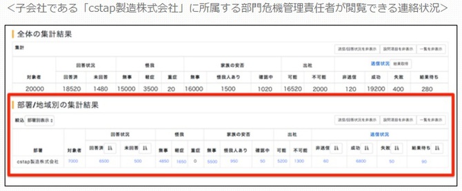緊急時には、各子会社で集計をした安否確認を、親会社では一括管理、各子会社では自分の組織のみ確認することが可能だ。