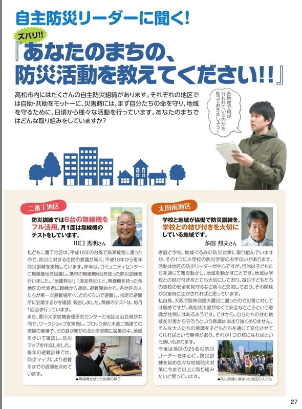 また大学生だけではなく、高校生も登場したり、地域の人もハザードマップの解説に登場します。「自主防災リーダーに聞く!ズバリ!!あなたのまちの防災活動を教えてください!!」というタイトルのあとに書かれていると、ただ自主防災リーダーが紹介されているだけの場合より読んでしまう気がするんですが、どうでしょうか?