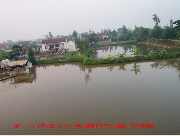 また、図1および図2に示す通り、飼育規模の比較的大きな畜産農家には、敷地内に大きな池が設けられており、その池には日中100羽以上の飼育されているアヒルが浮かんでいます。加えて、同じ敷地内では10数頭以上の数の豚も飼育されています。先進農家では、数頭のホルスタイン種の乳牛も飼育されています。しかし、どの農場にも、鳥インフルエンザ対策として重要な野鳥の侵入を防ぐ防鳥ネットは設置されておらず、野生動物の外部からの侵入を防ぐ柵も全く認められませんでした。