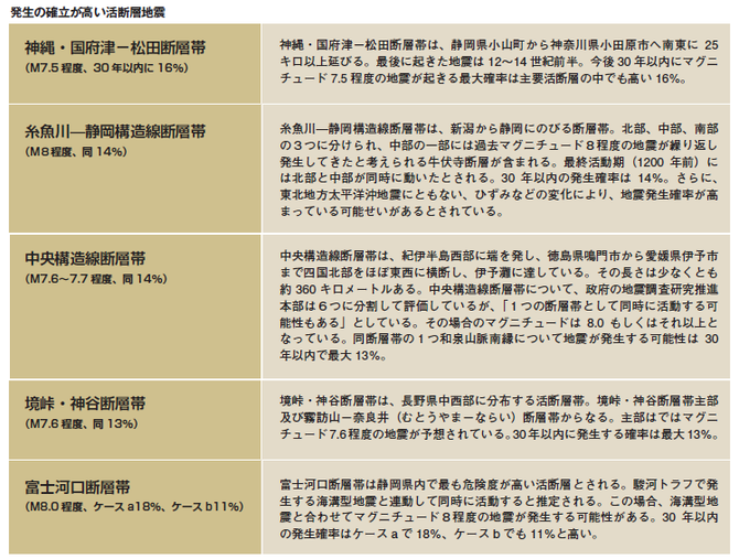 地震調査推進研究本部が今年1月 11 日に公表した最新の長期評価では、全国に約 2000 本あるとされる活断層のうち主要 108 の活断層について発生確率を評価。確率が「高い」ものとして①「神縄・ 国府津−松田断層帯」や、②「糸魚川̶静岡構造線 断層帯」 、③「中央構造断層帯」 、④「境峠・神谷断 層帯」などを上位にあげている。これら上位4つの活断層は、いずれもマグニチュードが7以上、特に 糸魚川̶静岡構造線断層帯については8程度とされている。また、富士山の南西から富士河口に延び る⑤「富士河口断層帯」については、過去の活動時期について2つのケースが考えられ、30 年以内に、 マグニチュード8程度の地震が高ければ 18%の確率で、低くても最大 11%の確率で起きると評価されている。