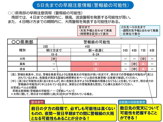 警報は数時間先のことを判断するために使うことができる情報ですが、明日・明後日といった先のことについて判断するために使える情報ではありません。この欠点を補うために2017年から導入されたのが「警報級の可能性」です。この情報は2019年より現在の名称「早期注意情報(警報級の可能性)」と改称されました。