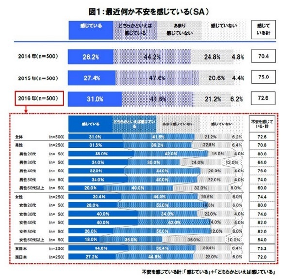 最近、何かに不安を感じていることはあるかという問い【図1】に、「感じている(31.0%)」、「どちらかといえば感じている(41.6%)」と、72.6%が回答した。また、男性(70.8%)に比べると女性(74.4%)の方が、より不安を感じている人が多い傾向が見て取れた。