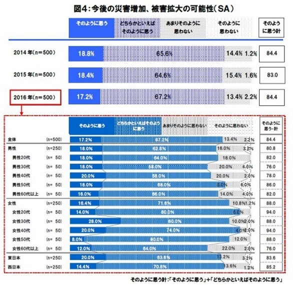 性年代別でみてみると、男性20代82.0%(昨年62.0%)、女性20代94.0%(昨年84.0%)、女性30代88.0%(昨年86.0%)、女性40代94.0%(昨年88.0%)で増加していて、相対的に若い世代や女性が災害増加に対して懸念が高まっていることが見て取れた。