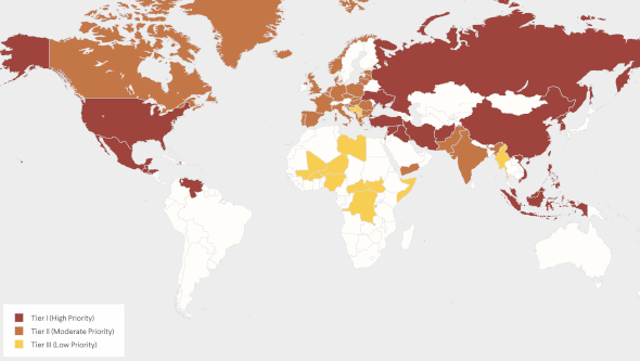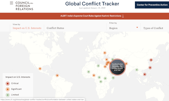 また、世界情勢は刻々と変化するが、本報告書は2019年11月時点での情報や認識に基づいており、これ以降の状況変化は反映されていないため、本報告書では最新の情報について「Global Conflict Tracker」というWebサイト(https://www.cfr.org/interactive/global-conflict-tracker)を参照するよう注意喚起されている。Global Conflict Tracker では図1のように、現在懸念されている非常事態の場所が地図上に示されており、該当箇所をクリックするとそれに関連する記事を読めるようになっている。