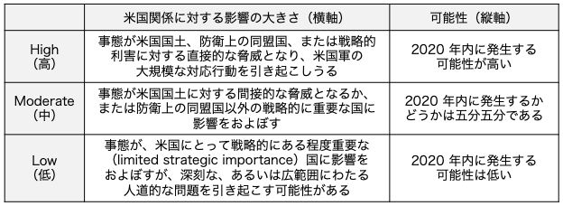 アンケートの内容は、今後12ヶ月の間に発生する可能性があり、かつ米国関係にとって有害となり得る30の非常事態について、それぞれ米国関係に対する影響の大きさと、それが発生する可能性の観点からランク付けをしてもらうというものである(注2)。ランク付けの基準は表1のとおりである。
