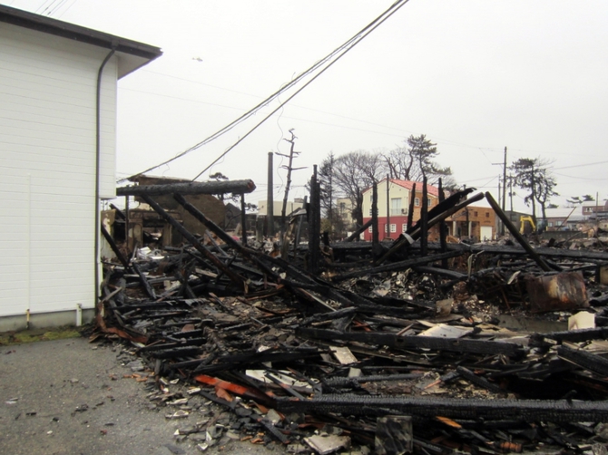 まず「防ぐ」ということで、オープンスペースや緑の大切さを指摘しておきたい。いかに燃え広がったかを診ることも大切だが、いかに焼け止まったかを診ることも欠かせない。上の写真は、海に近い北東の角から被災地を写したものであるが、手前の白い建物は消防隊の放水により延焼を免れている。建物の手前に大きな駐車場があり、そこに消防車を停め放水することができた。この事例に限らず、駐車場のあるところで焼け止まっている。消火活動を有効に展開できるように、消防通路や活動空地などを計画的に配置しておくことの大切さが示されている。