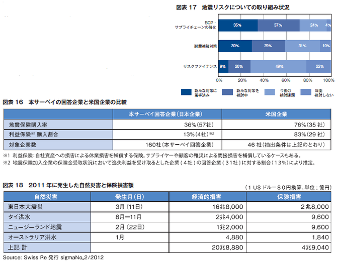「例えば、運転資金の確保に重きを置く場合、従来型の保険は実損補償を前提としていることから資金調達(保険金受取)即時性の観点から十分とはいえず、 特別な保険の組成や、 コミットメントライン、 地震デリバティブ、CAT ボンドなどの資本・債券 市場を活用したスキームも検討する必要があると考えられる」 (上垣内氏)