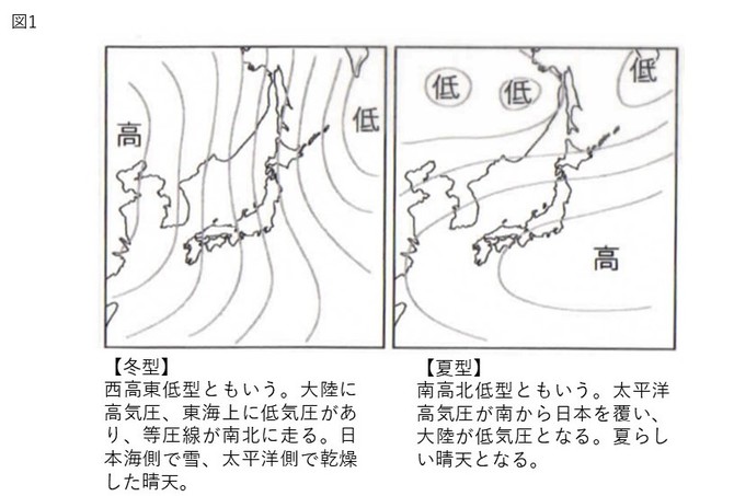 日本は季節風現象が明瞭で、春~夏は南風、秋~冬は北風が卓越する。気圧配置の種類に「夏型」、「冬型」といった季節名がそのまま名称となったものがある(図1)が、それらは季節風を吹かせる気圧配置で、その季節らしさを演出する。
