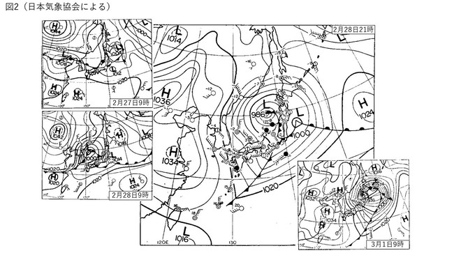 実際、図2で3月1日の天気図を見ると、低気圧の中心は八戸付近と根室付近に進み、それぞれ976ヘクトパスカルおよび974ヘクトパスカルまで発達している。東北地方は猛吹雪のため奥羽本線と羽越本線が全面不通となり、北海道は空と陸の交通が全域で停止し、翌2日も混乱が続いた。