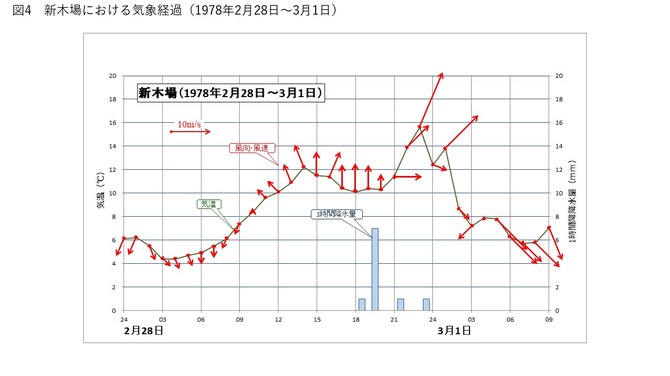 図4に、新木場(東京へリポート)における28日0時から3月1日9時までの気象経過を示す。気温を折れ線グラフで、風向・風速を赤矢印で、1時間降水量を水色の棒グラフで示している。新木場では、28日9時まで北寄りの風が吹いて低温であった。28日10時に南風に変わり、次第に風速が増して、23時には毎秒15メートルの南南西の風を観測している。1日2時には北西の風に変わった。この経過を見ると、新木場で「春一番」らしい強い南風が吹いたのは、28日夜から1日未明にかけての数時間である。
