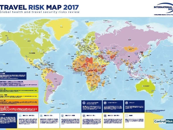 海外渡航に関する医療サービスや情報提供サービスを連携して行っているインターナショナルSOSとコントロール・リスクスは27日、渡航に関するリスクの度合を国別にまとめた「トラベルリスクマップ2017」と、75カ国における1119人の海外渡航者の安全管理担当者へのアンケート調査の結果を発表した。調査では回答者の72%がリスクの高まりを認識しているものの、44%がここ1年で海外出張は増加していると回答した。