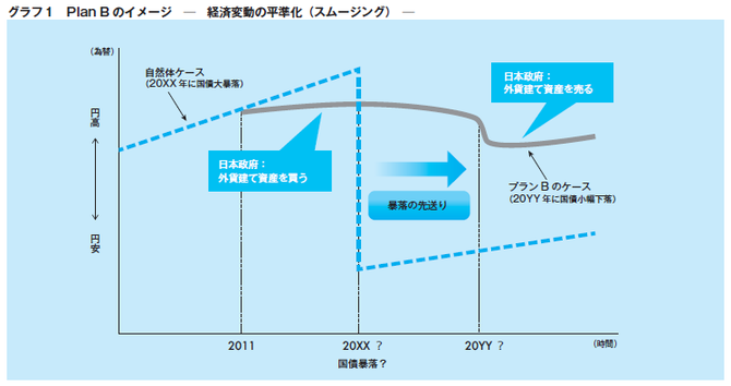 クライシスが避けられないとした場合、どういう緩和策があるのか。冒頭申しましたように、政府部 門が中心になって円高のうちに外貨建ての資産をなるべく蓄積して、将来、国債が暴落するような兆しが出たところで、その外貨建て資産を売り、経済の 変動を平準化するという政策が考えられます。