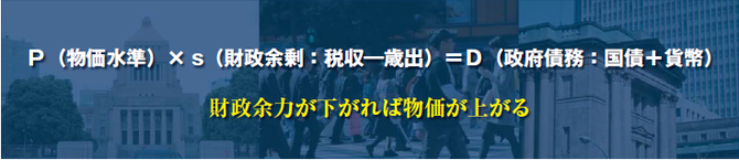 まず、右の D は、政府の借金、つまり国債と貨幣(日本銀行の債務)を足した債務の合計額になります。 一方、政府の資産は何かというと将来の税収にな るわけです。そこで日本政府の将来の実質的な価値 を s として、物価水準を P とすると、左辺の P × s は将来税収の名目価値ということになります。この式で、左辺を政府の資産、右辺を政府の負債、と読めば、政府のバランスシートの式そのものと見ることができます。