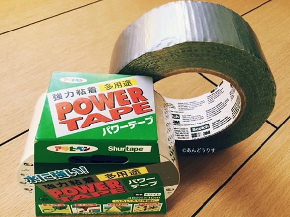 ということで、グッズの応急手当に使える万能ダクトテープについて説明しましょう。ダクトテープ以外に「ダックテープ」「パワーテープ」という商品名で販売されています。