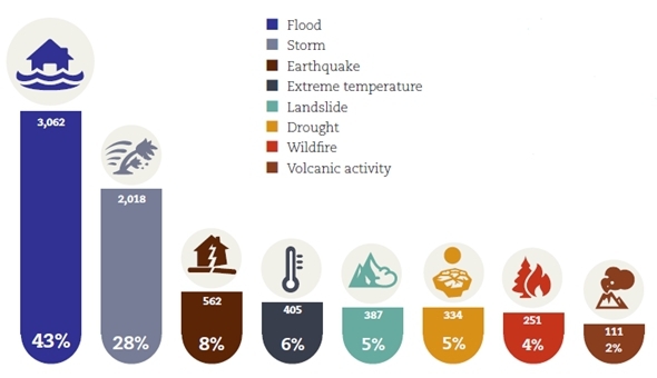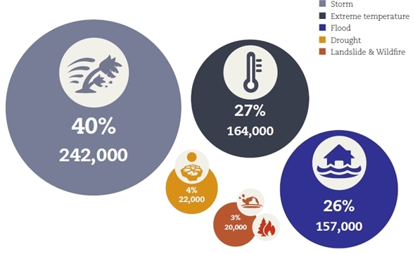 一方で死者数を見ると、嵐(ハリケーンやサイクロンなどを含む)による死者が最も多いことが分かる(図3)。なお嵐の 21% が南アジアおよび東南アジアで発生しており、これらの地域での死者が 8 割以上を占めている。本報告書では、多くの命を救うためには、特にリスクの高い貧困農村地域において、より効果的な早期警戒システムの整備や、シェルターや強風に耐えられる建物などの対策が必要であると指摘している。