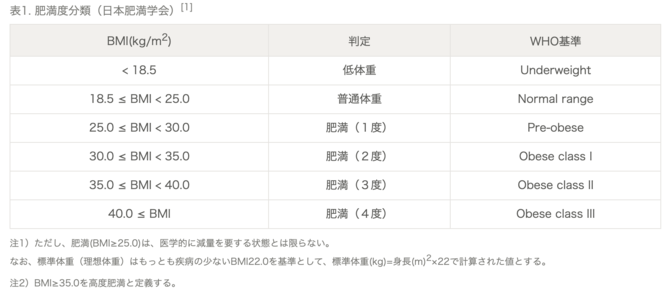 BMIは[体重(kg)]÷[身長(m)2]の式で算出する指数です。計算で出た数字をもとに「痩せ」や「肥満」を判断するために使います。ただし、出てくるBMIの値としては「16」や「28」といった数字のため、意味を取るためには以下のような肥満度分類という「基準」と照らし合わせる必要があります。この表を見て私たちはBMIの「16」が「低体重」、「28」は「肥満(1度)」を指すことが理解できるわけです。