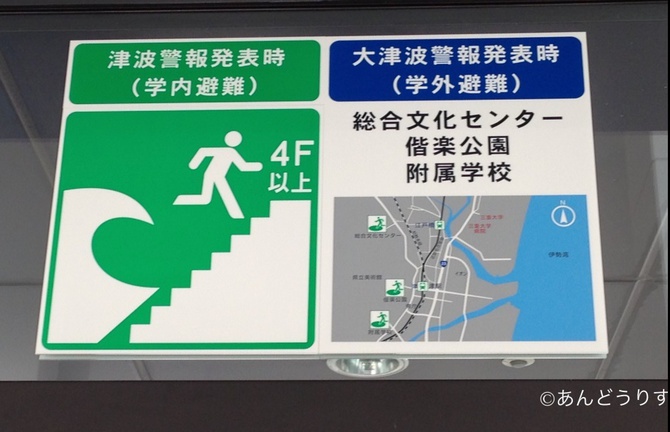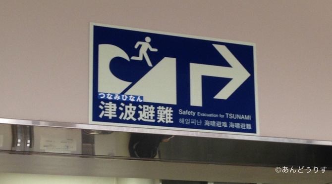 この中の津波の標識を覚えておいて、行く先々で確認してほしいです。実は地域によってマークが違うのです。だから、意識しないと目に入らないですからね!