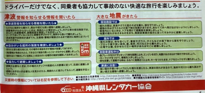沖縄でレンタカーを借りるとレンタカー協会の観光案内冊子がもらえるのですが、これが優れもの! 地震や津波情報が書かれていて、災害情報が得られるFMの周波数や情報発信サイト「沖縄防災情報ポータル」も紹介されています。また、こんなページもありました。