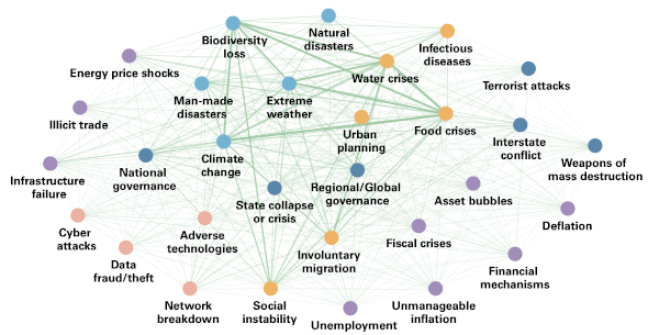 まず本稿のトップに掲載した図は、「Global Risks」というセクションからの引用で、52カ国の科学者222人に対して、地球全体におよぶ危機(global systemic crisis)を招きかねないリスクと、それらの相乗効果についてアンケート調査を行った結果をまとめたものである。