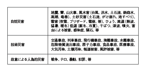 災害対策基本法では、災害を「暴風、豪雨、豪雪、洪水、がけ崩れ、土石流、高潮、地震、津波、噴火、地滑り、その他の異常な自然現象又は大規模な火事もしくは爆発その他の及ぼす被害の程度においてこれらに類する政令で定める原因により生ずる被害」と定義している。すこし解釈が難しいので簡単に整理すると、災害とは“自然災害”“技術災害”“故意による災害”の3つのカテゴリーに分けることができる。