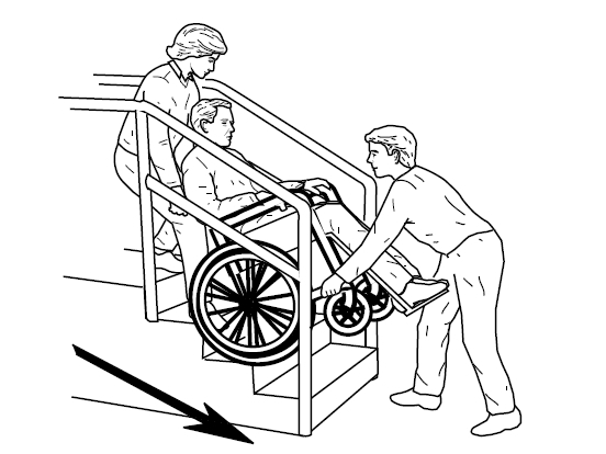 介助者のサポート付きで、利用者が乗った状態で車いすを階段で降ろす場合は、前向きで前輪を上げる形、つまりウイリーを下にした状態で前後に介助者がつき、後輪を一段ずつ、降ろしているようです。