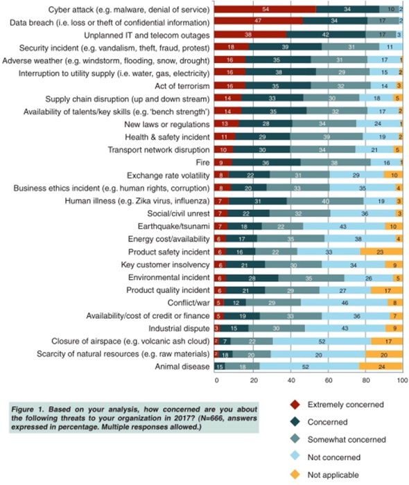 別の設問では、過去12カ月間に経験した事業途絶(business disruption)の原因をたずねているが、こちらに対する回答では「計画外の IT・通信の途絶」「異常気象」「ユーティリティ(水道、ガス、電力、廃棄物処理など)の途絶」が上位3つとなっている。「サイバー攻撃」は4位だが、「事業途絶」にまで至らないような規模のものまで含めた数字ではトップとなる。ちなみに異常気象は上図でも 5位に入っているが、2015〜16年は一時的に順位が下がっていた。最近発生した大雨や洪水などの影響で、再び関心が高くなってきたのかもしれない。