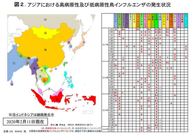 このウイルスは中国国内に広く拡散し、人での感染は収まらず、罹患者も冬期を中心に通年発生し続けました。さらに、このウイルスは2016年後半には高病原性を獲得するに至り、さらに危険度が高まりました。