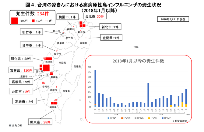 アジアではここ数年、ほとんど途切れなく発生が続いています[図2]。特に台湾[図3]、中国[図4]、ベトナムでの発生状況から、これらの国々では高病原性鳥インフルエンザウイルスはすでに定着していると考えられるほどです。これから少なくとも数年間は、現在の状況が継続すると予想されます。